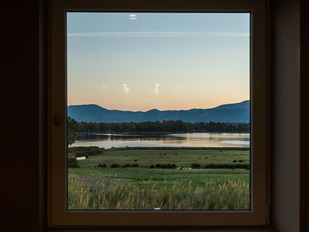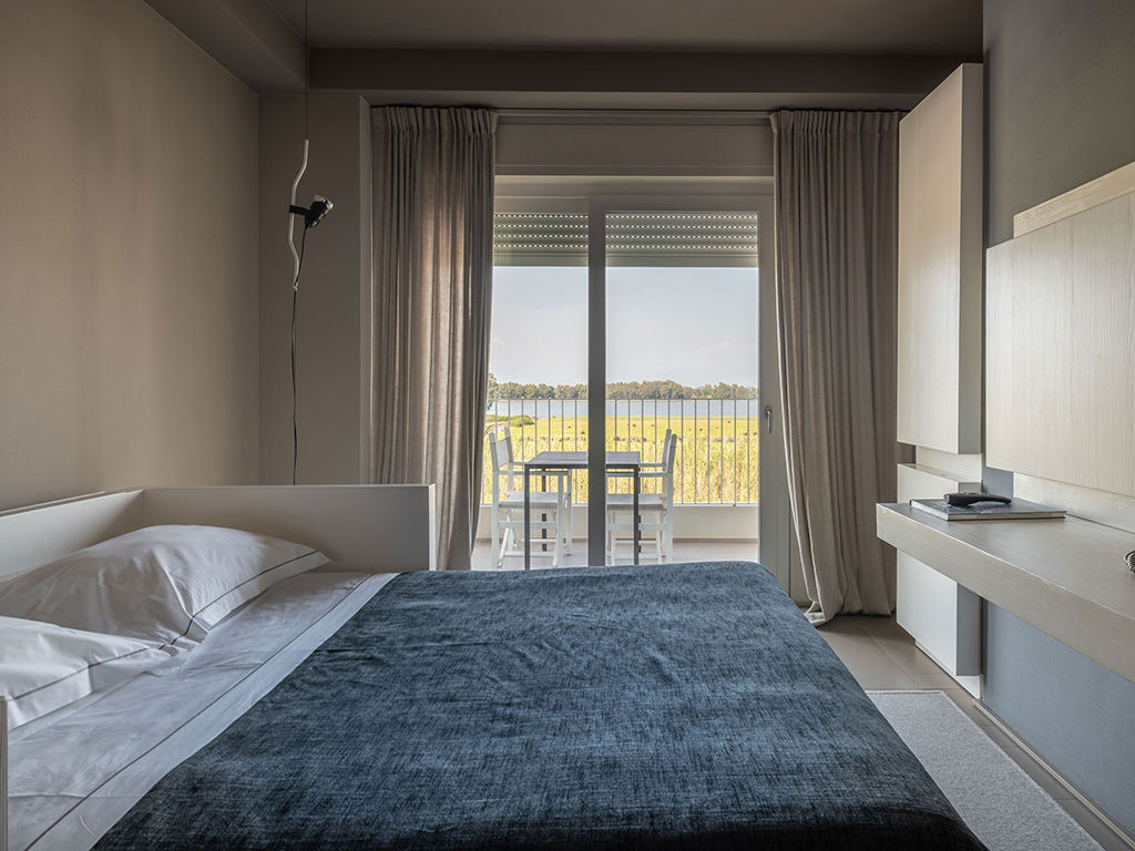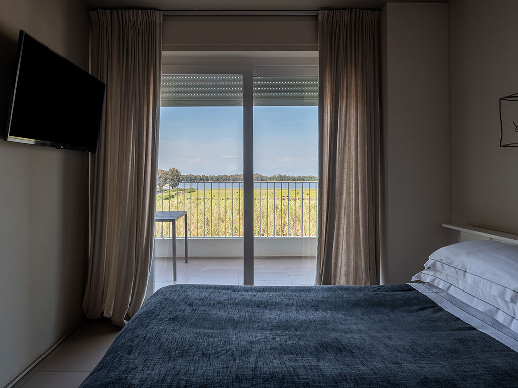 Camera di 30 m² con due ambienti e doppi balconi immersi sul Lago di Fogliano, con una finestra che regala anche una vista suggestiva vista laterale sul mare.